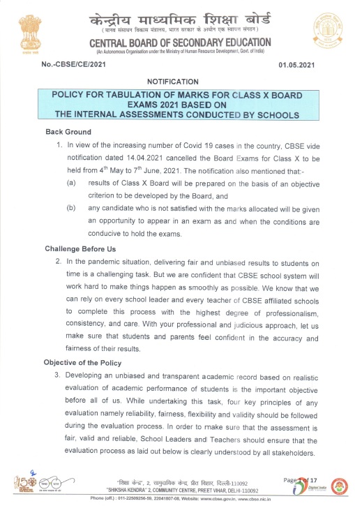 5) The Internal Assessment for 20 marks will be as per the existing policy laid out in the circular number Acad-11/2019 dated 6th March 2019, you can see circular through this link: http://cbseacademic.nic.in/web_material/Circulars/2019/11_Circular_2019.pdf Based on the circular, Internal Assessments have been done by the schools and a majority have uploaded their data on the CBSE portal. It is requested that all schools should upload the marks of internal assessment latest by 11th June 2021 as communicated earlier.