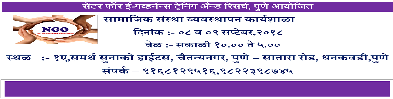 सेंटर फॉर ई-गव्हर्नन्स ट्रेनिंग अँन्ड रिसर्च, पुणे आयोजित सामाजिक संस्था व्यवस्थापन कार्यशाळा